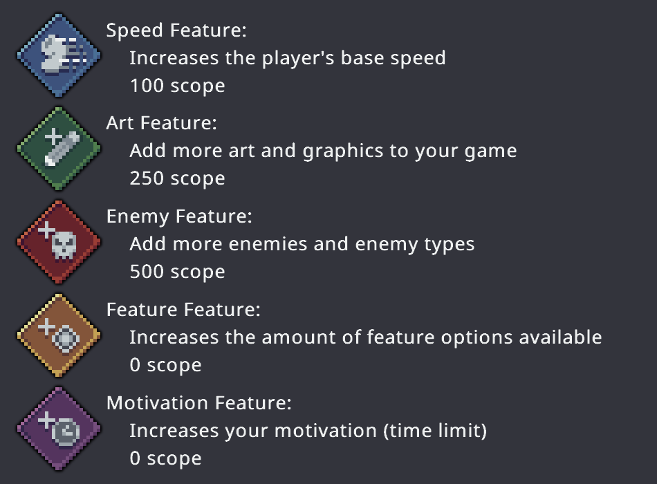 A platformer roguelike (?) in which you inflict development hell upon yourself. Stay alive to increase the scope of your game and code your way to new features, while avoiding exerting too much effort on fixing bugs and rushing - you might burn out otherwise!